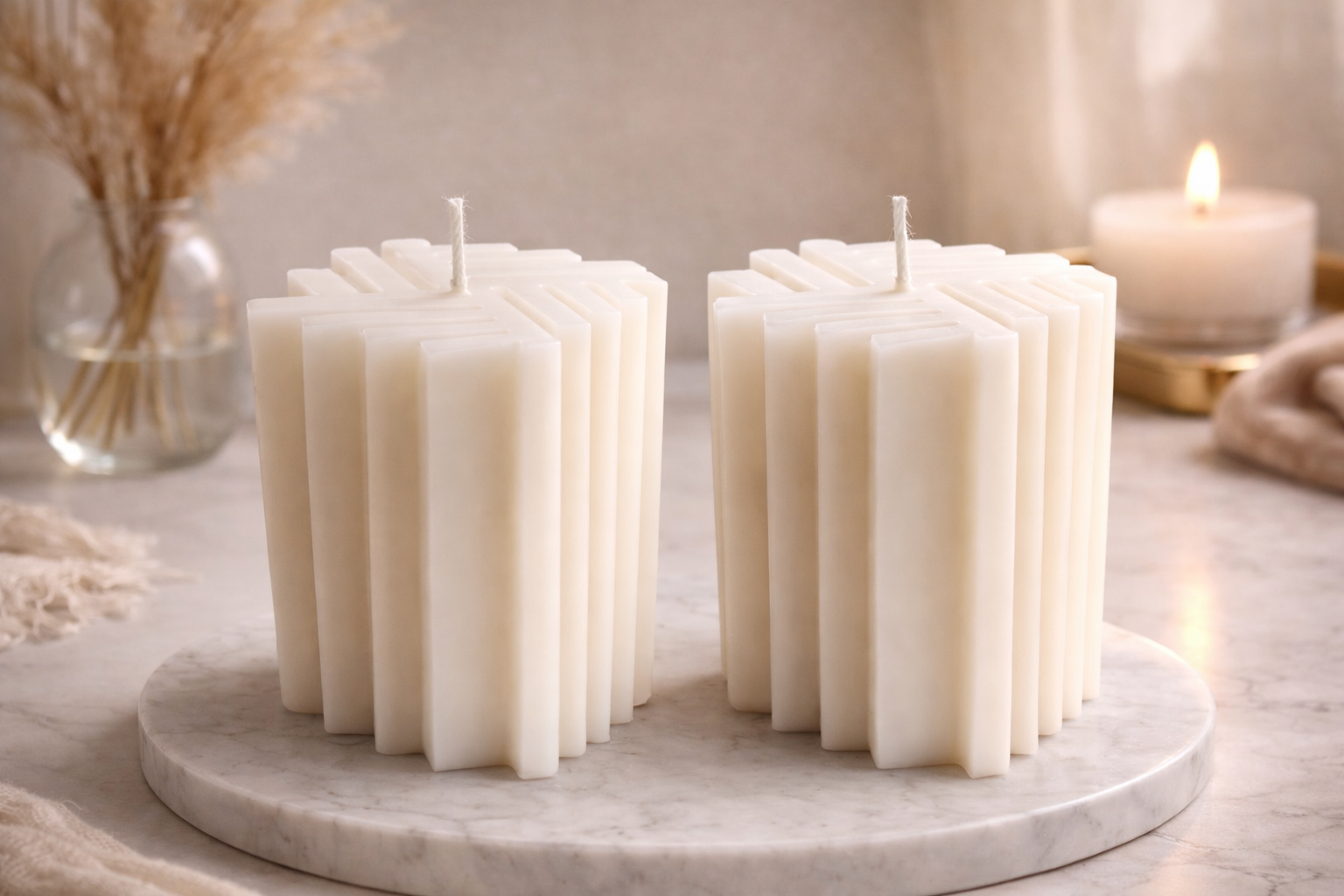Es una vela sin aroma, pensada para quienes valoran la estética y el diseño limpio. Su estructura en relieves verticales crea un juego de volúmenes que convierte cada pieza en un objeto decorativo moderno, ideal para salones, dormitorios o rincones especiales.
