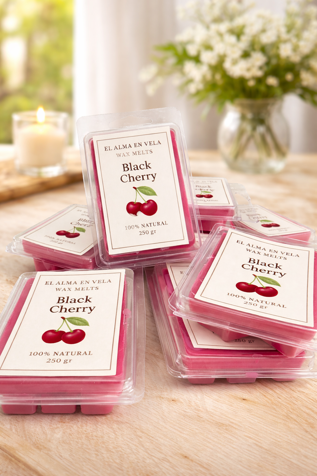 Los Wax Melts Black Cherburgos en formato tableta de El Alma en Vela desprenden un aroma intenso, afrutado y envolvente que transforma cualquier espacio.
